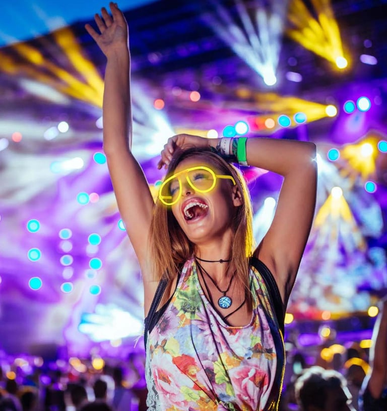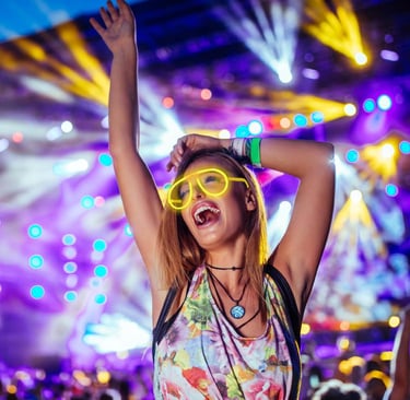 Gafas luces - Anillos luces - Vasos - Palos luminosos - Pines - Collares